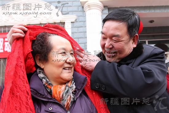 2014年2月13日,新疆哈密市新社区街道机辆路社区金婚夫妇秦亚民为老伴陈金桂掀盖头。