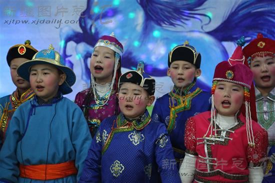 2014年2月12日,身着盛装的蒙古族儿童在庆祝活动中合唱。