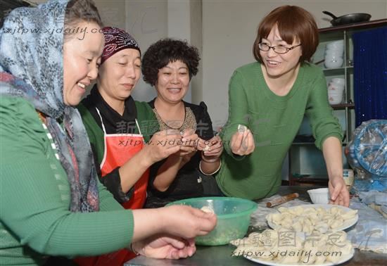 2014年2月12日,哈萨克族妇女和汉族妇女在一起参加包饺子比赛。
