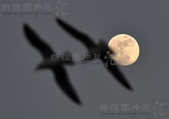 2014年2月12日晚,在新疆库尔勒市,两只水鸟从一轮明月前飞过。