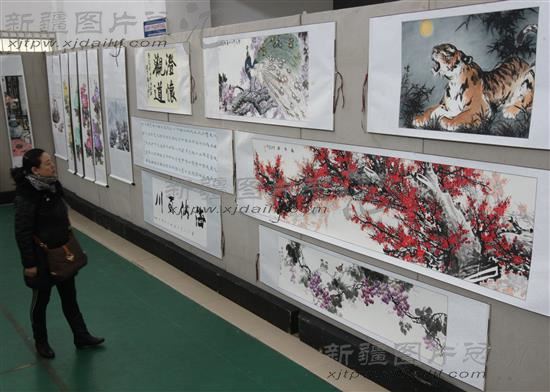 2月13日,市民在白碱滩区首届书画艺术节上欣赏本土名家书画。