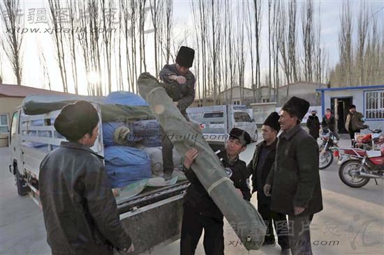 2014年2月13日,于田县阿羌乡阿羌村村民正在搬运救灾物品。
