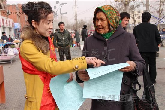 2014年2月14日,沙雅县农口部门的干部在该县银桥国际大巴扎上宣传各项惠农政策。