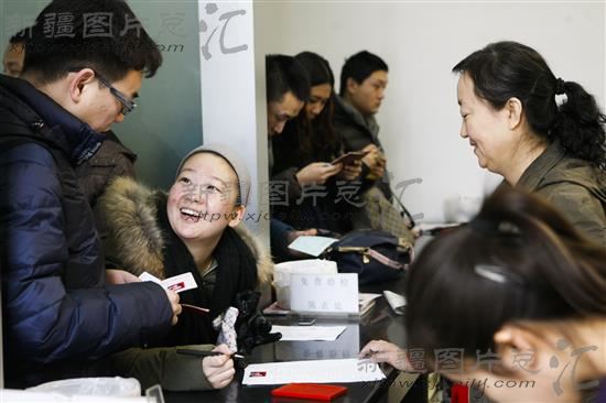 2014年2月14日,在乌鲁木齐市沙依巴克区民政局婚姻登记处,一对新人在办理结婚证。