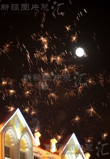 2014年2月14日,农历正月十五,新疆阿勒泰地区布尔津县城燃放的烟花,与天空中的圆月交相辉映。