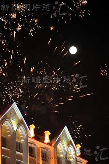 2014年2月14日,农历正月十五,新疆阿勒泰地区布尔津县城燃放的烟花,与天空中的圆月交相辉映。