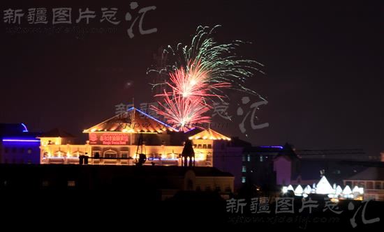 2014年2月14日,农历正月十五,新疆阿勒泰地区布尔津县城燃放的烟花,与天空中的圆月交相辉映。