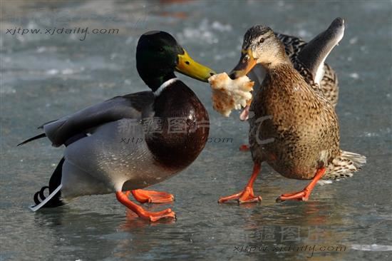 2014年2月15日下午,在库尔勒市孔雀河狮子桥下游,几只水鸟在分享食物。