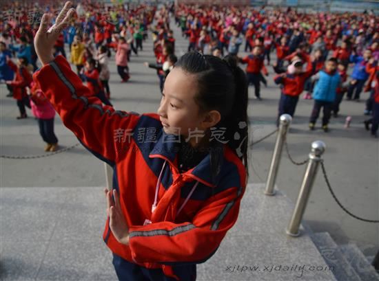 2014年2月17日,库尔勒市第四小学操场上,五年级六班周紫琪同学带领全校师生跳维吾尔族舞蹈《麦西来甫》。据了解,为了让全校师生尽快“收心”,回到正常的工作和学习当中,该校在分发教材前,特别设立“收心周”,让全校师生学跳《中华功夫》《兔子舞》《阳光体育健身操》等5个自创舞曲,还安排学习校风校训,以及民族团结、安全等相关方面的知识。