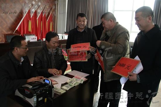 2014年2月17日,新疆昌吉回族自治州呼图壁县大丰镇村干部正在领取报酬补助。