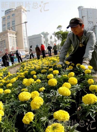 2008年4月5日,新疆巴音郭楞蒙古自治州库尔勒市园林工人在街头摆放鲜花。当日,库尔勒市园林局培育的春季40万株鲜花开始摆上街道。这标志着,库尔勒市“庆绿色奥运年”为主题的美化街道工作已启动。