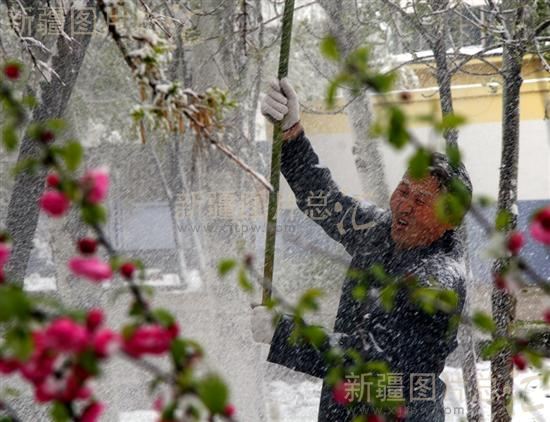 2008年4月8日,新疆昌吉回族自治州阜康市各街道办事处、社区组织干部群众上街清除树木上的积雪,以保护树木不受损伤。