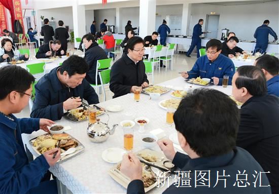 1月7日,张春贤书记在企业职工食堂用午餐时,和企业领导交谈。