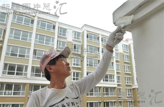 2013年6月13日,工人在有3000套公共租赁住房的伊宁市佳合宜苑小区粉刷、除尘。