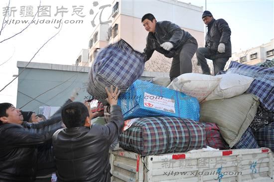 2014年2月19日,新疆哈密市锦顺苑小区捐赠点,几位居民将捐赠物资装上汽车准备运往于田县地震灾区。