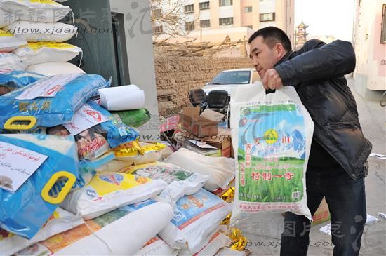 2014年2月19日,新疆哈密市锦顺苑小区捐赠点,一位市民前来向于田县地震灾区群众捐赠米、面等生活用品。