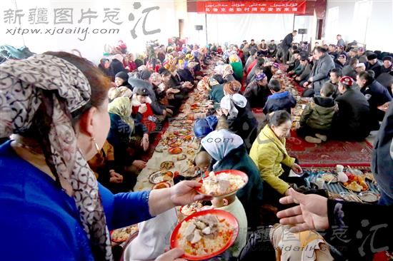 2014年2月19日,新疆哈密市五堡镇乌鲁克尧勒村各族群众在一起聚餐喜庆春天的到来。