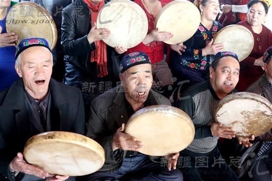 2014年2月19日,新疆哈密市五堡镇乌鲁克尧勒村民间艺人在传唱青苗麦西来甫曲目。