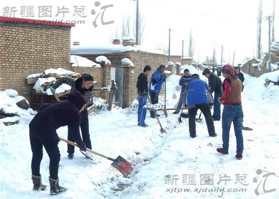 2014年2月20日,裕民县哈拉布拉镇文化街社区工作人员与社区居民在积极清除居民区道路两旁渠沟内的积雪。近日,天气转暖,为预防融雪型洪水的发生,裕民县动员干部职工和群众展开清雪行动,及时清除城乡疏通洪渠道、桥涵积雪。