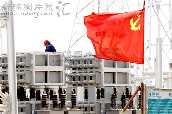 2013年6月28日,哈密南至河南郑州±800千伏特高压直流输电工程哈密换流站建设工地党旗在微风中飘扬。疆电外送哈密南至郑州±800千伏特高压直流输电工程开建以来,各项目部纷纷成立了多支共产党员突击队。广大党员以饱满的激情和无穷的活力奋勇争先、攻坚克难,让共产党员的先锋模范带头作用在建设工地上得到了充分发挥,促进“疆电外送”工程的顺利推进。