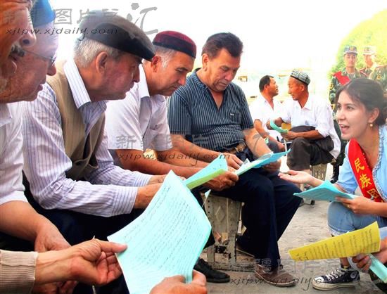 2013年7月4日,在新疆阿克苏地区库车县乌尊镇中心小学,维稳宣传员为当地群众深刻揭批暴力恐怖分子的犯罪行径,大力宣传民族团结、同仇敌忾对创造美好生活的重要性。连日来,该县出动流动宣传车800余次,发放宣传单、宣传手册10万余份,在全县城乡积极发表主流、正面声音,强化正面引导。
