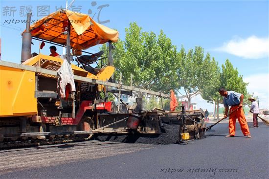2013年7月9日,工人在给路面铺设沥青。新疆阿克苏地区新和县投资600余万元,对城区5条主干道路面进行重新罩面,项目于6月24日开工,预计7月底完工。届时,将有效改善道路老化的现状,切实方便群众出行。