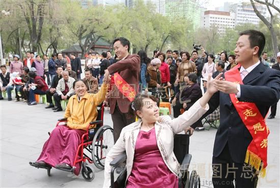2008年4月29日,残疾人和志愿者一起跳起“轮椅华尔兹”。当天,新疆乌鲁木齐市友好南路街道办事处在人民公园举办“残健同行、共享奥运”残疾人趣味运动会,100多名残疾人和志愿者、老年人共同参加了8个项目的比赛活动。