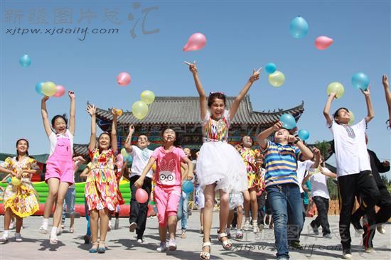2013年7月7日,新疆阿克苏地区阿瓦提县考入内初班的学生在儿童公园内举行放飞梦想活动。今年该县有135名学生考入内初班,他们将于8月底带着梦想赴对口学校实现自己的“梦想”。
