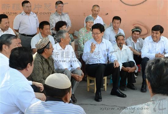2013年7月3日上午,中共中央政治局委员、自治区党委书记张春贤来到乌鲁木齐市天山区大湾片区明华街社区,与社区居民亲切交谈。