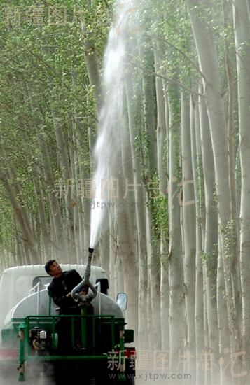 2008年4月10日,新疆阿克苏地区阿克苏市林业部门工作人员给防护林喷洒药液防治春尺蠖。为了有效预防春尺蠖大面积发生,该市林业部门及时调集打药车,配套高射程车载喷雾机械喷洒无公害药液防治春尺蠖虫害。