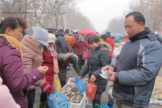 2014年2月21日,18连职工徐峰正在花园集市出售食用菌。 徐峰去年利用冬闲时间培育2万多袋蘑菇、金针菇等食用菌,已给他帶来近2.5万元的收入。
