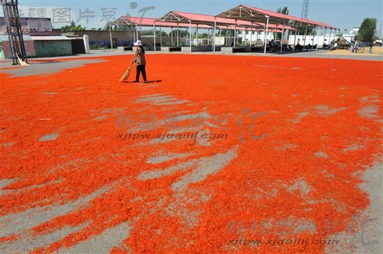 2013年7月17日,新疆伊犁哈萨克自治州伊宁县曲鲁海乡农民在晒红花。眼下,伊宁县近万亩红花进入采收期。红花单产达到30公斤,亩综合产值达到2280元,成为干旱地区农民增收的一个新亮点。