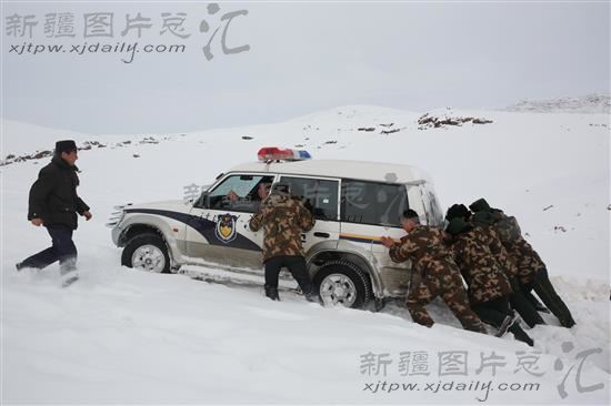 2014年2月22日,新疆富蕴县公安边防官兵和机关干部在帮助受阻车辆。