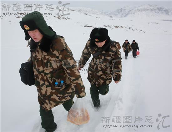 2014年2月22日,新疆富蕴县公安边防官兵和乡机关干部踏雪前往救援地。
