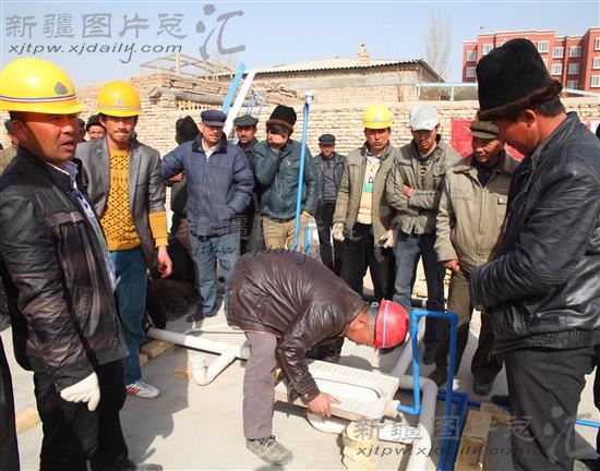 2014年2月23日,巴楚县阿瓦提镇农民正在学习组装暖气管的技术。