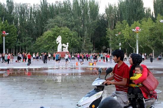 2013年7月2日,新疆喀什市各族群众在人民公园休闲广场欢歌起舞。每天清晨和傍晚喀什各族群众就会在人民公园的休闲广场,唱歌跳舞,打球健身,形成一道和谐惬意的风景线。