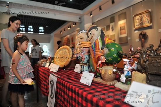 2013年7月12日,市民在民族工艺品展览上参观。当日,第三届中国新疆国际民族舞蹈节配套活动----新疆礼物(民族工艺品类)设计大赛作品展在乌鲁木齐市7坊街创意产业集聚区B区开展。