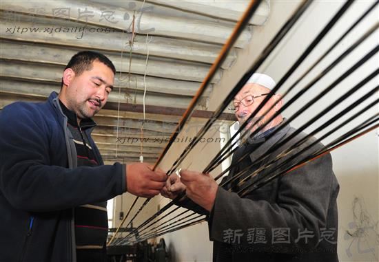 2月24日,奥斯曼(左)给老艺人介绍从杭州考察带回的艾德莱斯绸制作新工艺。