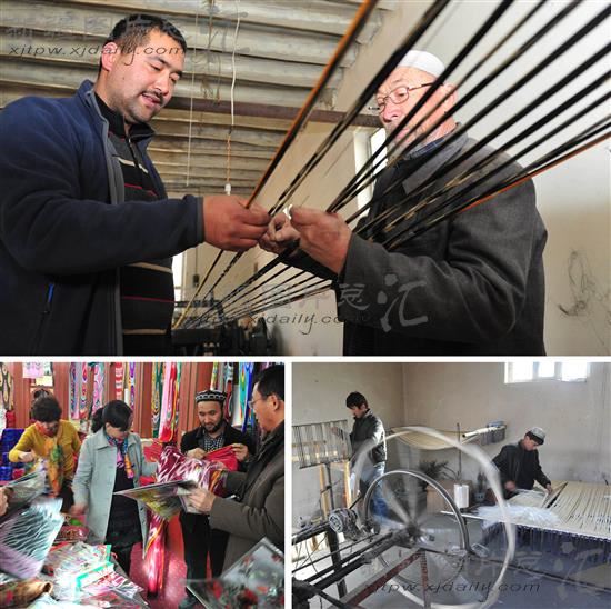 2月24日,奥斯曼(左)给老艺人介绍从杭州考察带回的艾德莱斯绸制作新工艺(上);前来参观的游客在选购艾德莱斯丝绸制品(左下);工人在制作艾德莱斯绸。