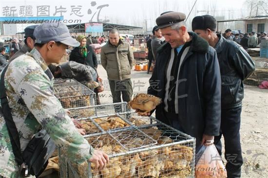 2014年2月22日,温宿县托乎拉乡水稻农场的农牧民在家禽市场上选购雏鸡鸭苗。该县把大力发展家禽养殖业作为农业增效、农民增收的一项重要措施来抓,县农牧主管部门及时安排家禽养殖企业孵化鸡鸭鹅雏苗投放市场。