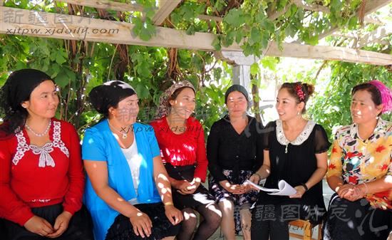 2013年8月26日,新疆阿克苏地区拜城县布隆乡干部热孜宛古丽(右二)在对阿克墩村妇女进行宣讲。连日来,拜城县选派县,乡,村干部进村入户,面对面分类宣讲党的惠民政策,民族宗教政策,法律法规等,受到群众欢迎。