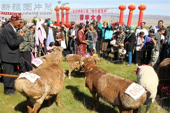 2013年8月22日,新疆哈密地区伊吾县盐池镇各族农牧民牵着打扮好的肥羊准备参加赛羊大会。当日,伊吾县盐池镇各族农牧民在一起举办了赛羊大会,通过抱羊跑、选秀羊、比眼力、宰肥羊等比赛形式喜庆丰收,别开生面的比赛活动吸引众多农牧民和游客观看。