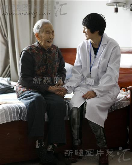 2014年2月24日,在焉耆回族自治县社会福利服务中心,工作人员陪95岁高龄的辛玉老人聊天。