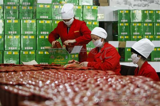 2014年2月25日,焉耆牙生江食品有限责任公司的工人在包装产品。据了解,该企业采用维吾尔族传统工艺加工辣椒酱、番茄酱等62种产品,90%产品在疆内销售。2014年,新厂房竣工投产后,将提供就业岗位250个,使周边乡村农牧民“足不出户”就能找到工作。