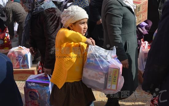 2月21日,于田县老城区街道受灾群众在领取爱心企业捐赠的大米、饼干等物资。老城区街道办事处党支部书记库尔班·沙吾提介绍说,这已是发放的第五批爱心物资了。