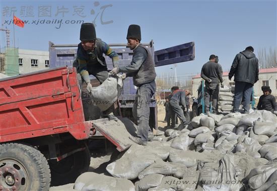 2月21日,于田县阿羌乡受灾群众在搬运社会爱心企业捐赠的建筑材料。目前,灾区群众正积极准备水泥、砖块、木材等建筑材料,4月份天气回暖后即可开工。