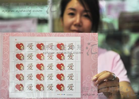 2013年8月13日,工作人员在展示“七夕”邮品。当日是农历“七夕”,乌鲁木齐市邮政局推出“浪漫七夕·永恒之爱”珍藏纪念系列贺卡、邮票等产品。据介绍,此次“浪漫七夕·永恒之爱”贺卡产品问世恰逢国家邮政局首次发行的“日常贺卡专用不干胶邮票”的全国首发,所以该产品全部选用“特种不干胶邮票”,使得此次系列产品更具纪念意义与收藏价值。