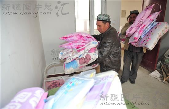 2014年2月25日,皮山县克里阳乡亚尔克里克村干部在搬运新采购的被褥、炉灶等生活用品。