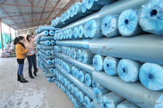 2014年2月25日,新疆博乐市乌图布拉格镇宝龙塑业加工厂内,工人正在检查即将出厂的地膜。春耕在即,博州多家农资生产企业开足马力加紧生产农资,确保春耕化肥供应。目前,全州生产地膜、滴灌带、水带、肥料等农资生产企业有92家,其中地膜、滴灌带、水带等农资满足全州市场需求。