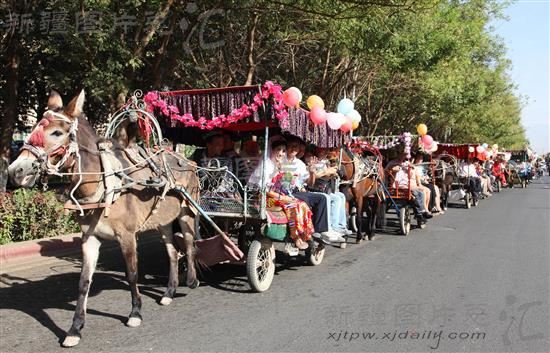 2013年8月22日,22对新人乘坐的婚礼驴车行走在吐鲁番市街头。这是吐鲁番举办的民族集体婚礼参加新人最多的一次,倡导婚事新办简办的新型婚育观念。